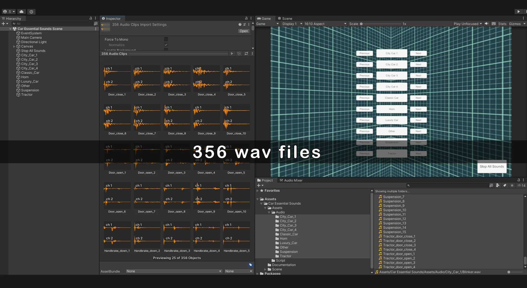 Car Essential Sounds is a high quality sound pack featuring 356 WAV files of car interactions, including doors, windows, blinkers, horns, wipers, suspension, and more for immersive vehicle audio.